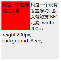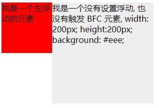 <div style="width: 200px; height: 200px;background: #eee">我是一个没有设置浮动, 也没有触发 BFC 元素, width: 200px; height:200px; background: #eee;</div>
